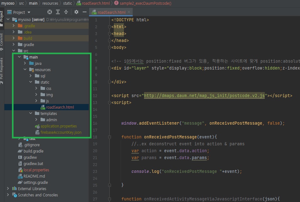 구체적인 주소 검색 방법은 안에 삽입된 "postcode.v2.js" 스크립트가 해주는 것 같고, 우리는 이 받은 값을 안드로이드에 전달하는 부분을 집중하면 된다.